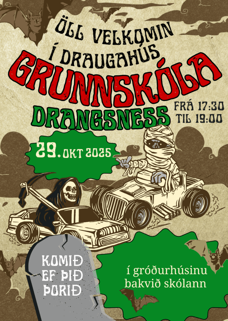 Verið velkomin í draugahús í Grunnskóla Drangsness miðvikudaginn 29. október frá kl. 17:30 – 19:00.